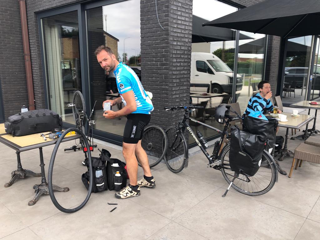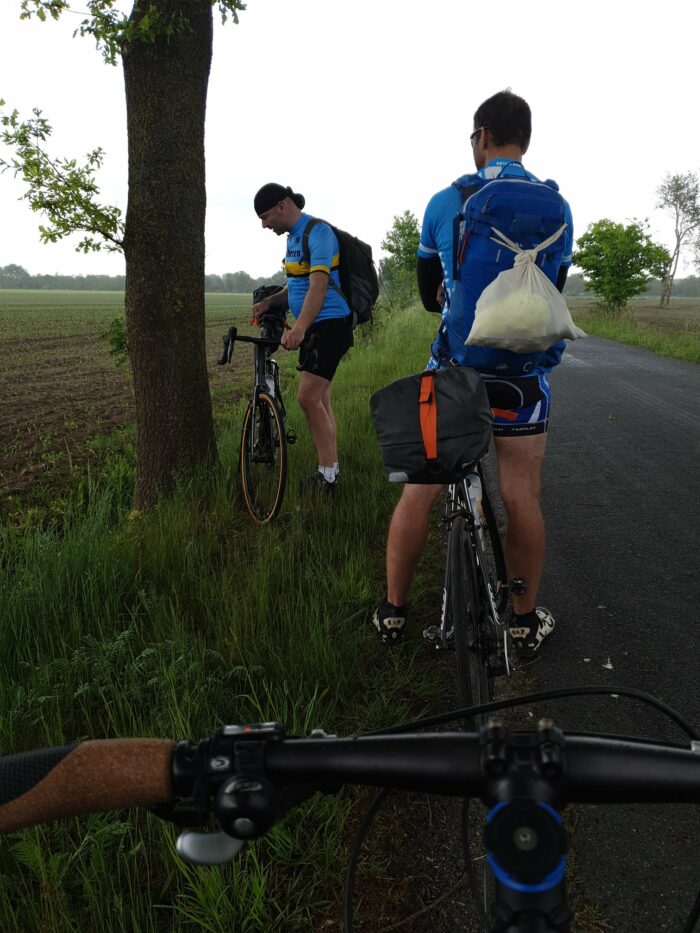 Wie geplant ging es nicht los. Durch gewisse Umstände zog sich der Start etwas hin. Ein Zweitsattel sollte jeder immer dabei haben.😜 Als wir losfuhren gingen die ersten Kilometer recht zügig von der Hand. Einen kurzen Stopp zur Restevertilgung bauten wir dennoch vor der Mittagspause ein. Nach ca. 60 km war Mittagspause in Zeven angesetzt. Während der Suche nach einem gescheiten Rastplatz viel auf, dass Kay Milch verlor und der Vorderreifen platt war. So kam es zum erste Platten der Tour.