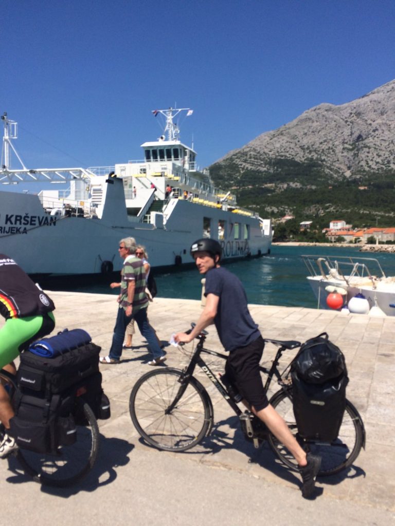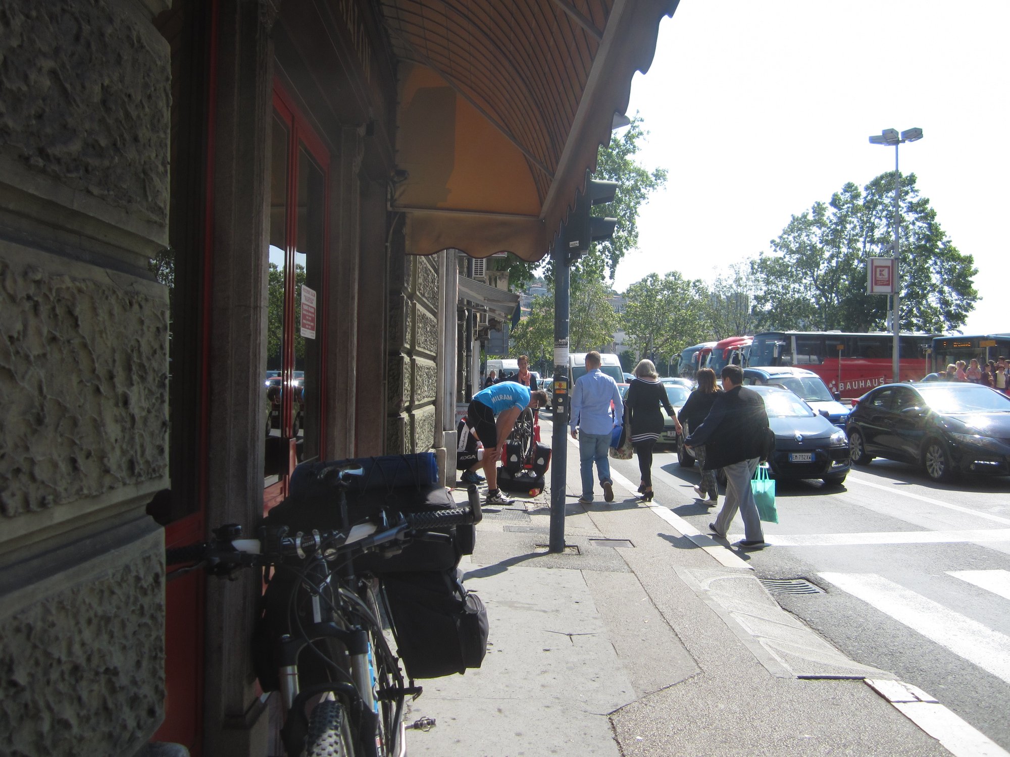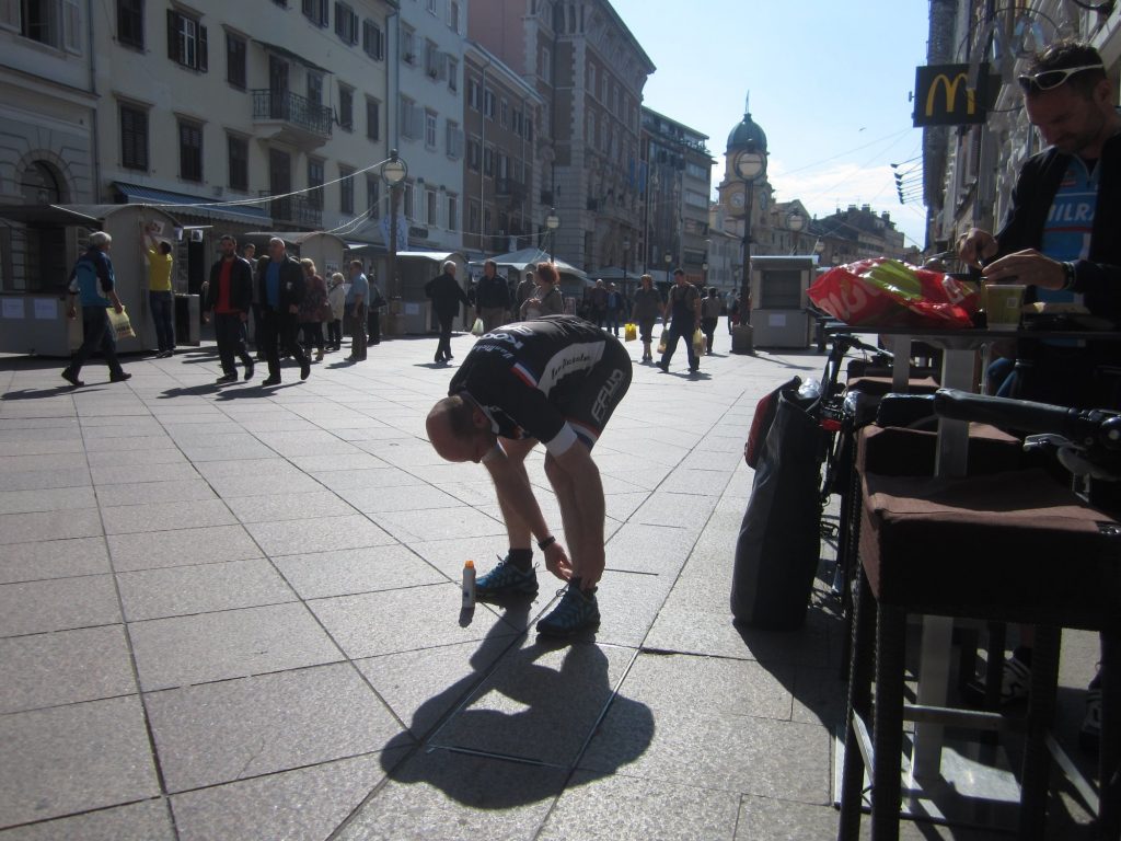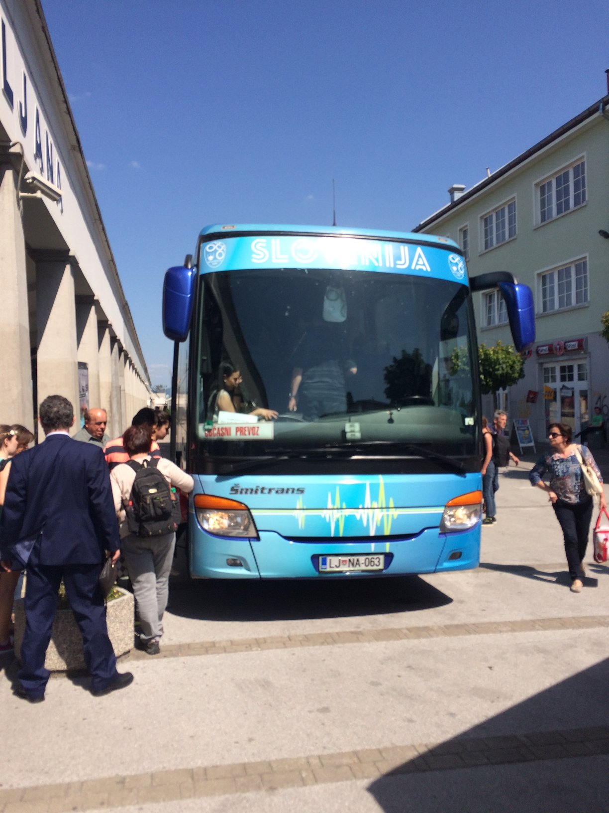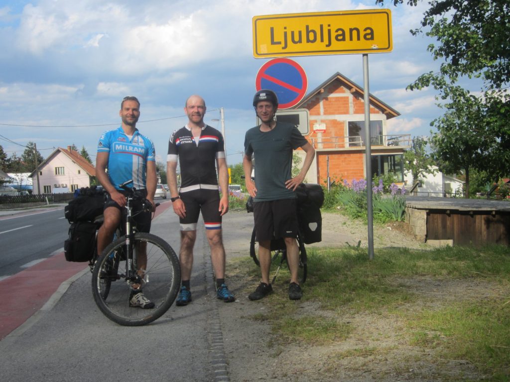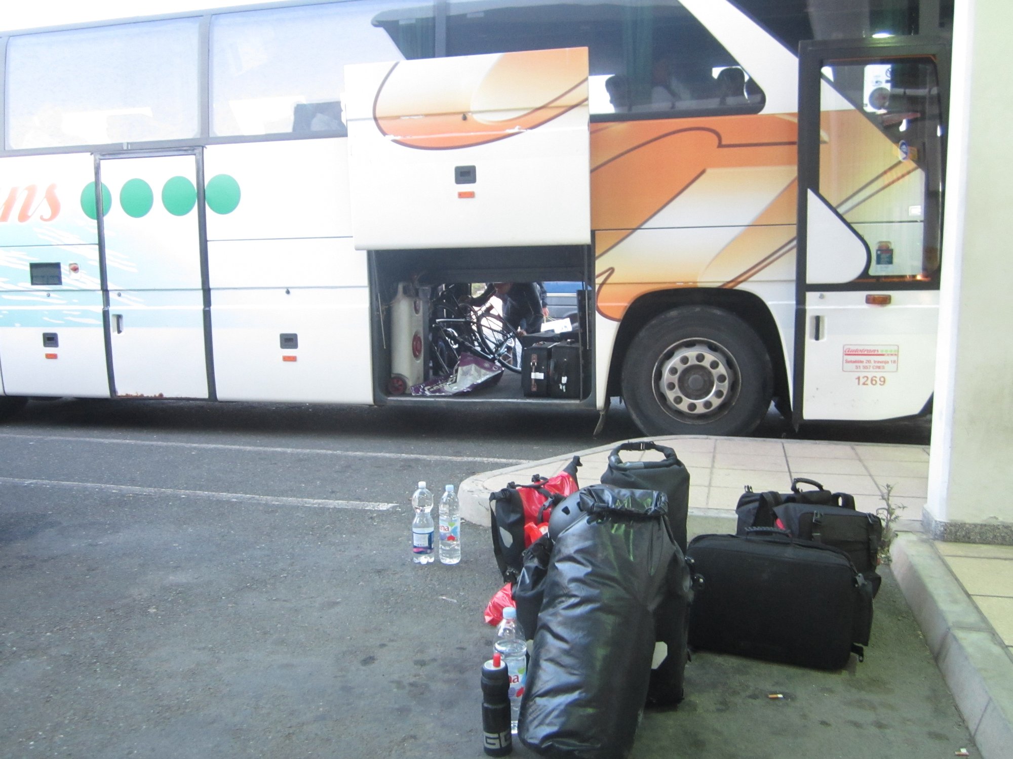 Um ca. 14:45 Uhr waren wir am Hauptbahnhof. Unsere Verbindung ging um 15:27 Uhr von Ljubljana über Villach – München – Hannover – Bremen, wo wir an nächsten Tag um 08:39 Uhr ankommen sollten. Beim ersten Blick auf die Anzeigetafel sahen wir für Villach nur eine Busverbindung. Am Schalter wurde uns die Verbindung mit dem Bus bestätigt. Es gab einen Schienenersatzverkehr bis Jesenice und anschließend sollte es weiter mit dem Zug nach Villach gehen (Eigentliche Umsteigezeit laut plan 7 min). Am Bussteig trafen wir die Vierergruppe aus Triest wieder, die 23% Steigung bergauf fuhren, wo es für uns bergab ging. Die Gruppe wurde schon von dem zuständigen slowenischen Einweiser instruiert und war tiefenentspannt. Insgesamt kamen vor Abfahrt 8 Räder mit Gepäck zusammen. Der slowenische Einweise erzählte uns dann, dass unsere Fahrräder mit Gepäck in einen Kleinbus geladen werden und wir mit einem separaten Bus befördert werden. Jetzt kam ein wenig Chaos auf, da auch nicht ganz klar war in welchen Bus wir steigen sollten. Doch das klärte sich zum Glück kurz vor Abfahrt und es ging mit etwas Verspätung los.