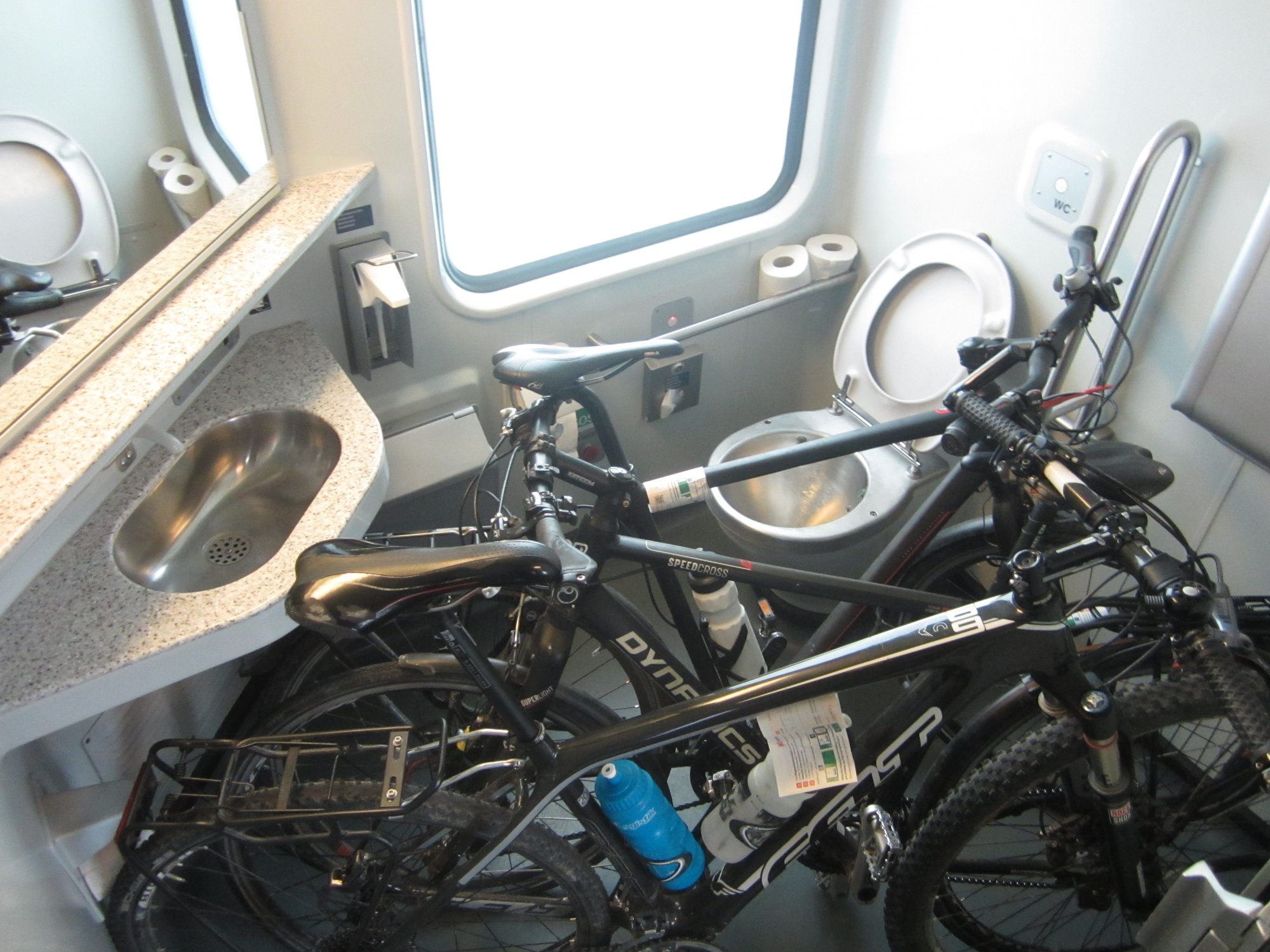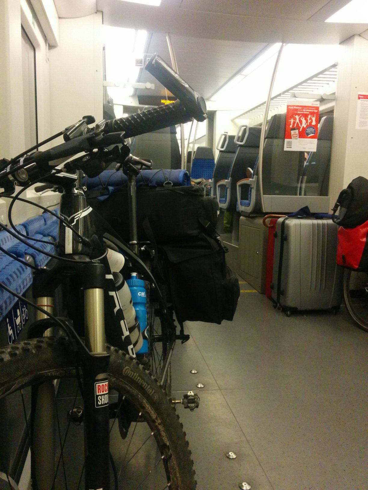 Doch die Freude währte nicht lange. Die Anzeige für die Reservierungen zeigte, dass ab Koblenz alle Plätze belegt waren. 🙁 Wir wandten uns an die Schaffnerin. Der erste Versuch war nicht erfolgreich. Es hieß „Bis Koblenz und weiter nicht“. So schnell gaben wir aber nicht auf. Der zweite Versuch verpuffte leider ebenso. Nach einiger Zeit sollte sich das Blatt doch noch wenden. Da die behinderten Toilette defekt war durften wir unsere Fahrräder dort platzieren und die Tür wurde verriegelt. 🙂