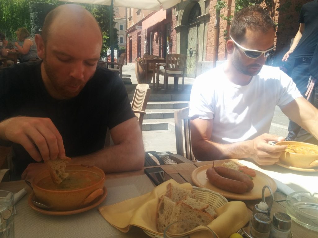 Nach dem Feierbier ging es zur Unterkunft, die ca. 5 min mit dem Rad vom Stadtzentrum entfernt war. Wir drehten aber einen extra Runde an Fluss entlang, um noch etwas mehr Eindrücke der Stadt zu sammeln. An der Unterkunft angekommen wurden wir schon erwartet. Die Einweisung und Schlüsselübergabe wurde schnell vollzogen, sodass wir mit Sachen ablegen und duschen, relativ zügig wieder in der Stadt waren. Nach einen kleine Snack an einer Dönerbude setzten wir uns draußen an eine Kneipe. Hier werkelte eine Gruppe von jüngeren Leuten an mehreren typischen Slowenischen Pony ROG Rädern herum. Wie sich herausstellte gab es Pakete, die ein komplettes Rad in Einzelteile enthielten. Das Ganze kam einer Prüfung nah. Den kompletten Aufbau eines Rades konnten wir uns aber nicht ansehen, da wir von der letzten Etappe etwas geschafft waren und sich der Aufbau durch Getränkepausen etc. in die Länge zog.