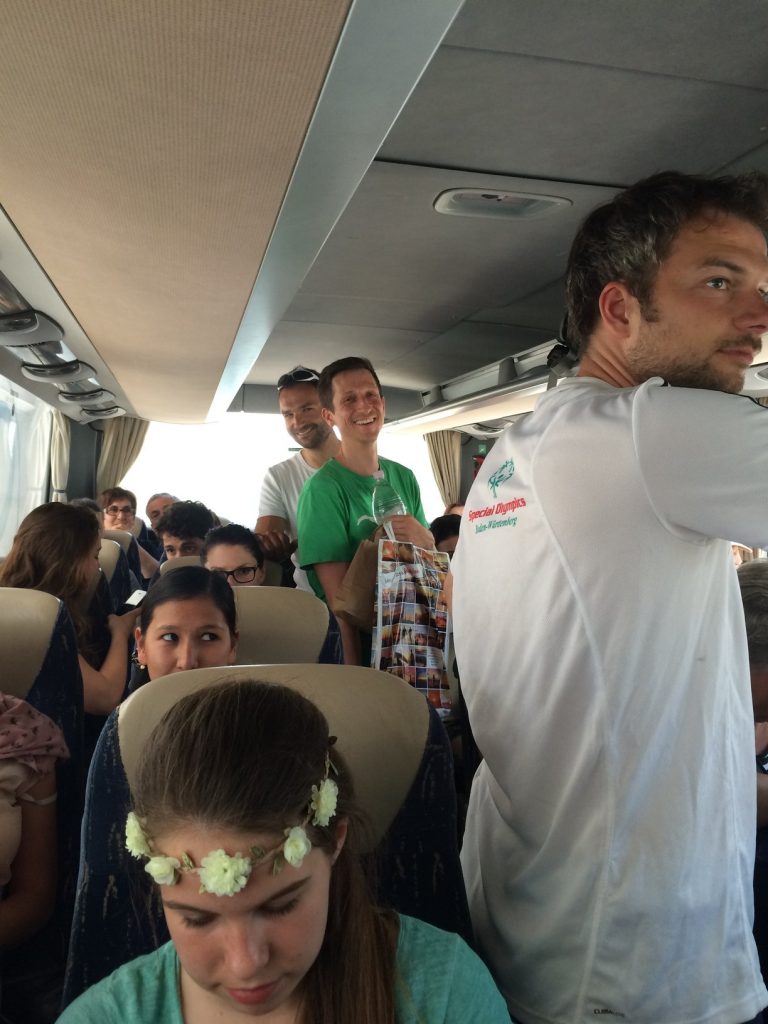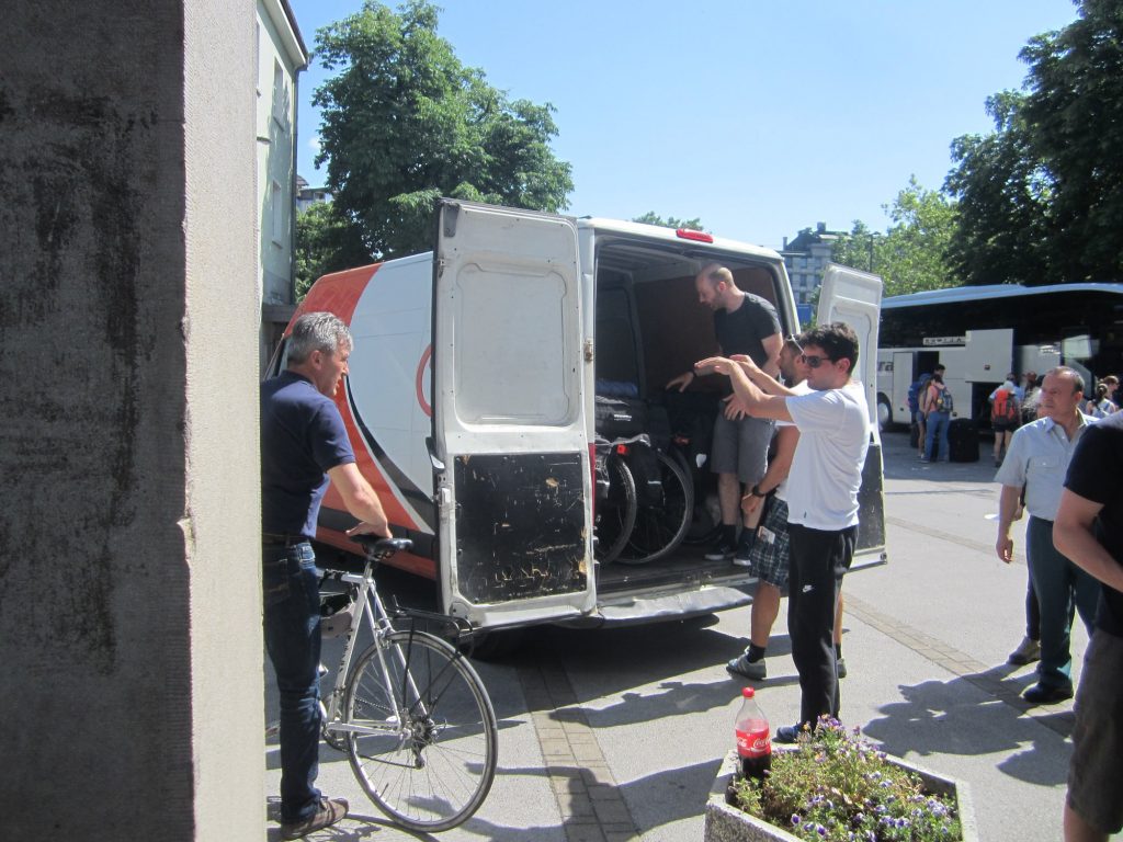 Der Passagierbus voran und der Gepäckbus hinterher. Nach ein paar Staus und ausfallenden Bemerkungen einer verhaltens auffälligen Person, nahmen wir wahr, dass uns der Gepäckbus nicht mehr folgte. Wir schmunzelten etwas und hofften, dass wir unsere Räder samt Gepäck später am Zielbahnhof vorfinden würden. Eine Haltestelle bevor wir wieder auf den Zug umsteigen sollten, gab es erneut etwas Chaos, da der Busfahrer etwas von „Jesenice aussteigen“ murmelt. Daraufhin stiegen so gut wie die Hälfte der Personen aus. Vor dem Bus tauchte wie aus heiterem Himmel der Einweiser aus Ljubljana auf, wo wir uns fragen, wo dieser aus einmal her kam. Er schickte uns glatt wieder zurück in den Bus und es gab einen kleinen Disput mit dem Busfahrer. Weiter ging die wilde Fahrt… In Jesenice angekommen war von dem Gepäckbus weit und breit nichts zusehen. Die Busfahrer beruhigten uns etwas und ca. 5 min. später kam dann auch der der Bus. Ungewöhnlich war nur, dass die Reihenfolge der Räder komplett verändert wurde. Es fehlte aber zum Glück nichts.