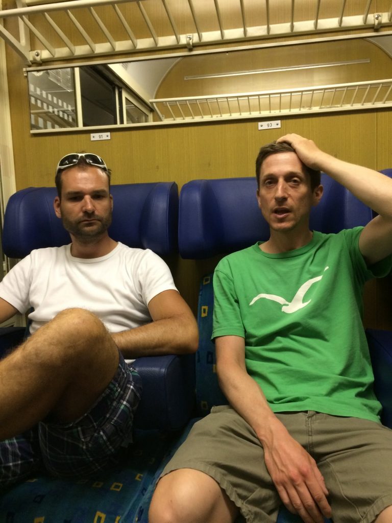 Weiter ging es zum Zug, wo uns das nächste Dilemma erwartete. Der Zug war nicht für Fahrräder ausgelegt und dann sollten auch noch 8 davon mit. Oha! Der Schaffner war jedoch so gnädig und stellte uns separate Sitzabteile für die Räder zur Verfügung. Somit musste niemand zurück bleiben. Die nächste Herausforderung stand schon bevor, da wir zum Zeitpunkt wo wir in Villach losfahren sollten erst in Jesenice los kamen. Wir mussten uns somit schon mal nach neuen Verbindungen umsehen. Kurze Verbindungen gab es zu dieser Zeit nicht mehr. Ich Villach wurde noch Versuch etwas über die österreichische und die deutsche Bahn abzuwickeln. Die Angebote waren jedoch nicht so wie gedacht. Daraufhin wollten wir unser Glück in München noch mal versuchen und fuhren auf gut Glück weiter.