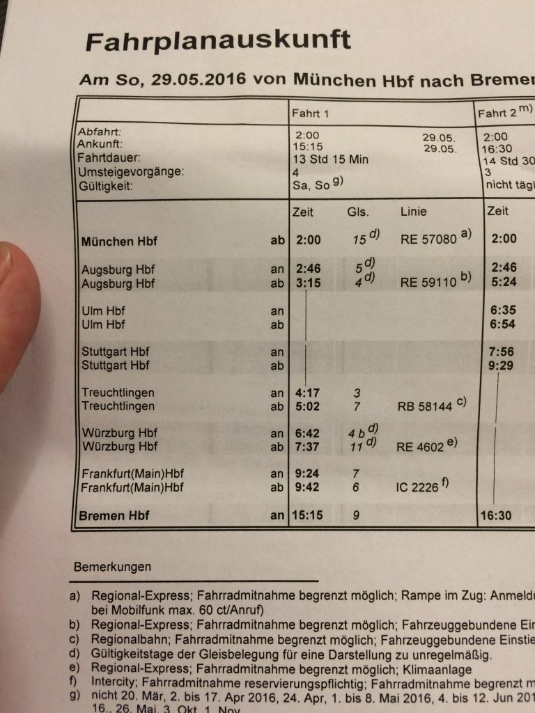 Ohne aus einem Zug geworfen zu werden schafften wir es bis nach München. Gegen 0 Uhr ging es direkt zum Info-Point. Hier empfahl man uns im Intercity Hotel zu nächtigen ohne direkte Erstattung, da die DB nicht an Verspätung des vorherigen Zuges beteiligt war. Mit ca. 75,-€ pro Person hätten wir in Vorleistung gehen müssen und hätten es evtl. nicht erstattet bekommen. Wir entschieden uns weiter zu fahren. Mit den Regio-Zügen und mehrfachen umsteigen ging es nach Frankfurt.