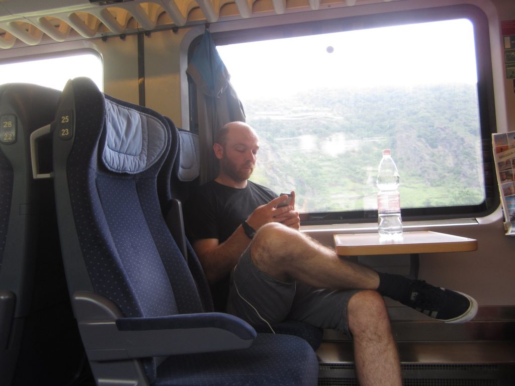 Doch die Freude währte nicht lange. Die Anzeige für die Reservierungen zeigte, dass ab Koblenz alle Plätze belegt waren. 🙁 Wir wandten uns an die Schaffnerin. Der erste Versuch war nicht erfolgreich. Es hieß „Bis Koblenz und weiter nicht“. So schnell gaben wir aber nicht auf. Der zweite Versuch verpuffte leider ebenso. Nach einiger Zeit sollte sich das Blatt doch noch wenden. Da die behinderten Toilette defekt war durften wir unsere Fahrräder dort platzieren und die Tür wurde verriegelt. 🙂